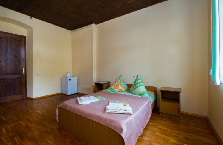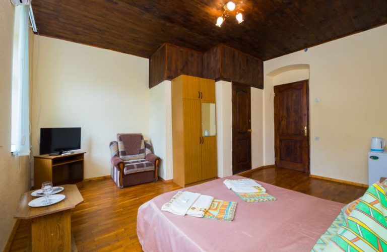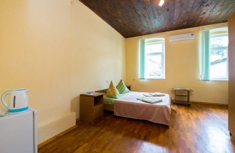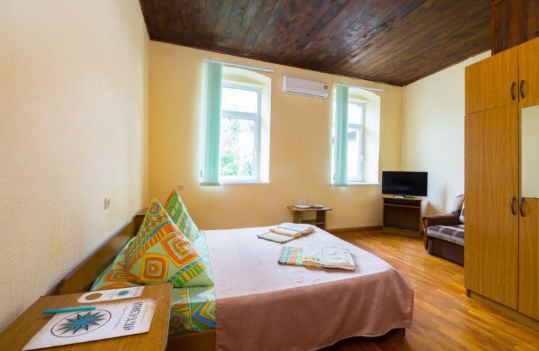 Площадь номера - 30 кв.м. 2 осн. места. 1 доп. место. Мебель: вешалка, зеркало, кресло-кровать, кровать двуспальная, прикроватные тумбочки, столик журнальный, стулья, шкаф. Оборудование: кондиционер, мини-холодильник, телевизор, чайный набор посуды, электрочайник. Санузел: с душем, туалетные принадлежности, фен. Сервис: Wi-Fi бесплатно, смена полотенец, смена постельного белья, уборка номера.