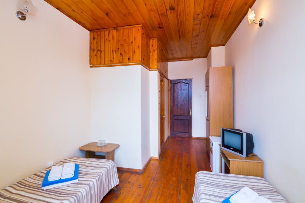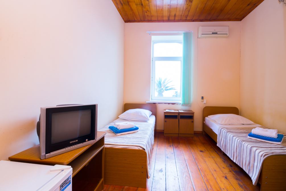 Площадь номера - 20-25 кв.м. 2 осн. места. 1 доп. место. Мебель: вешалка, зеркало, кровати односпальные (2), прикроватные тумбочки, тумба, шкаф. Оборудование: кондиционер, мини-холодильник, телевизор, чайный набор посуды, электрочайник. Санузел: с душем, туалетные принадлежности, фен. Сервис: Wi-Fi бесплатно, смена полотенец, смена постельного белья, уборка номера.